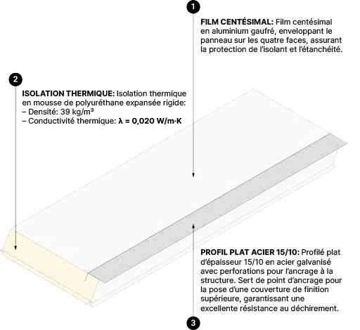 FILM CENTÉSIMAL : Film centésimal en aluminium gaufré, enveloppant le panneau sur les quatre faces, assurant la protection de l’isolant et l’étanchéité.